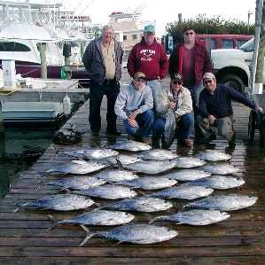 From mid-October thru mid-December, yellowfin tuna fishing is outstanding. By the first or second week in October, schools of yellowfin return to waters off Oregon Inlet and hang out for a few months. These fall fish are often big (40-80 lbs) and hungry. Some years, they settle into the area, and we catch them chunking with butterfish on standup tackle. Other years, they seem to move around more, and we get them trolling. In either case bring plenty of coolers. This is also the time of year, particularly late September to mid November, when the seasons best wahoo catches are made, mixed in with the schools of yellowfin tuna or along the current edges inshore of the tuna.