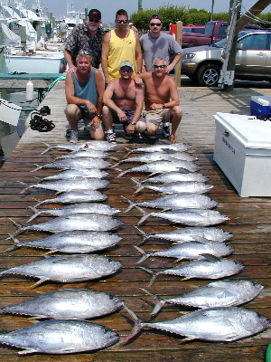 June-mid July.....June thru mid-July continues to offer outstanding fishing for several species offshore of Oregon Inlet. This is the early peak billfish season, particularly blue marlin which can be 100-1000 lbs, and if you spend the day in search of them, probably will get a few shots. White marlin and sailfish are a regular companant of the catches. Yellowfin tuna fishing is excellent throughout the period, and some of the largest yellowfin of the year are landed in June and early-July. Dolphin are plentiful around sargassum lines which occur along the Gulf Stream's edge or around large floating objects. June offers some of the year's best fishing for big 'gaffer' dolphin (10-50 lb fish) on light tackle. From mid-June thru late-July, we often have some incredible bigeye tuna fishing, and althought they don't bite every day or every year, when they do these 100-250 lb critters are brutally tough battlers and great eating. Wahoo are available as well.